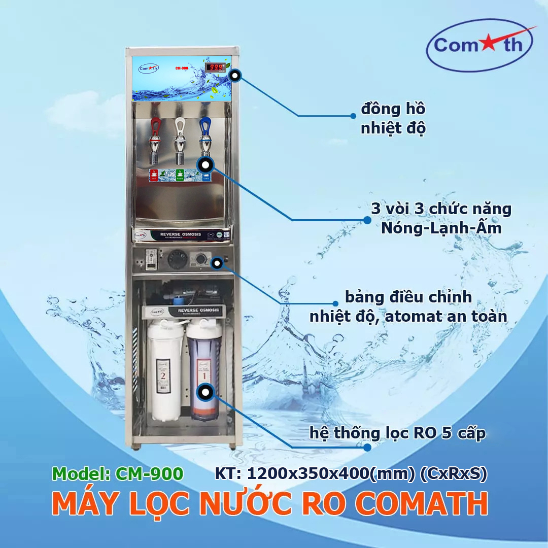 Máy lọc nước 3 vòi 3 chức năng Comath CM900 đáp ứng đủ mọi nhu cầu về nước uống trực tiếp. Đặc biệt phục vụ tiện ích cho mọi gia đình thời hiện đại, công việc bận rộn, sau những giờ làm việc trở về nhà có nước nóng nấu nướng nhanh chóng, tiết kiệm thời gian. Bên canh đó với đa chức năng máy lọc nước phù hợp phục vụ tiện ích cho công sở, trường học, bệnh viện, xí nghiệp...